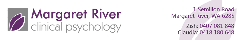 Counselling & Psychotherapy in Margaret RiverMargaret River Clinical Psychology Practice, is located at: 1 Semillon Road, Margaret River, Western Australia, 6285 The Margaret River Psychology practice is conveniently located on the west side of town, with plenty street parking available for clients. Two highly experienced and well qualified Registered Clinical Psychologists offer their services: